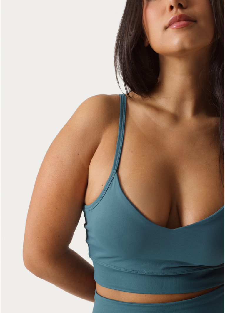 Sutiã com alças e decote em V. Contém copas mas são removíveis. Confortáveis e resistentes. Bom suporte.