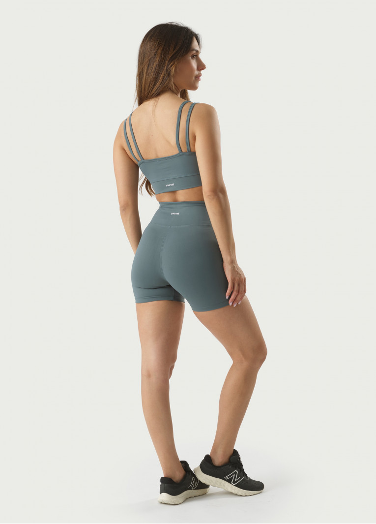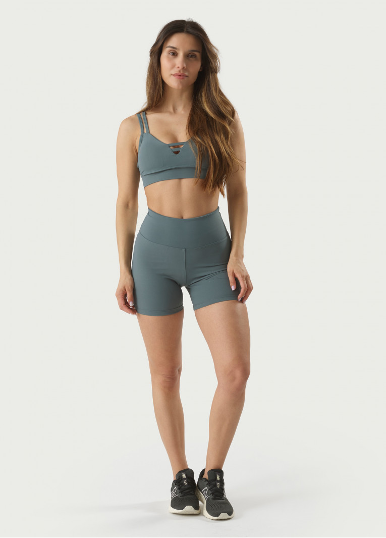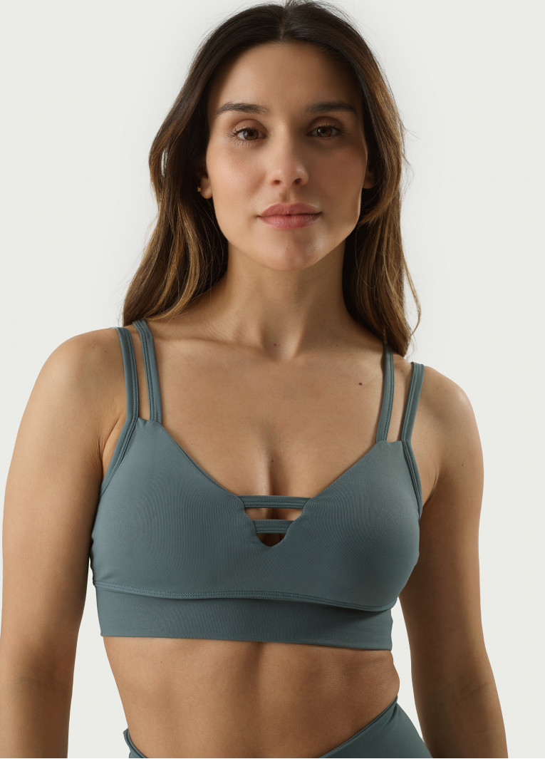 Sutiã com duas alças e decote em V. Contém copas mas são removíveis. Confortável e resistente. Bom suporte.